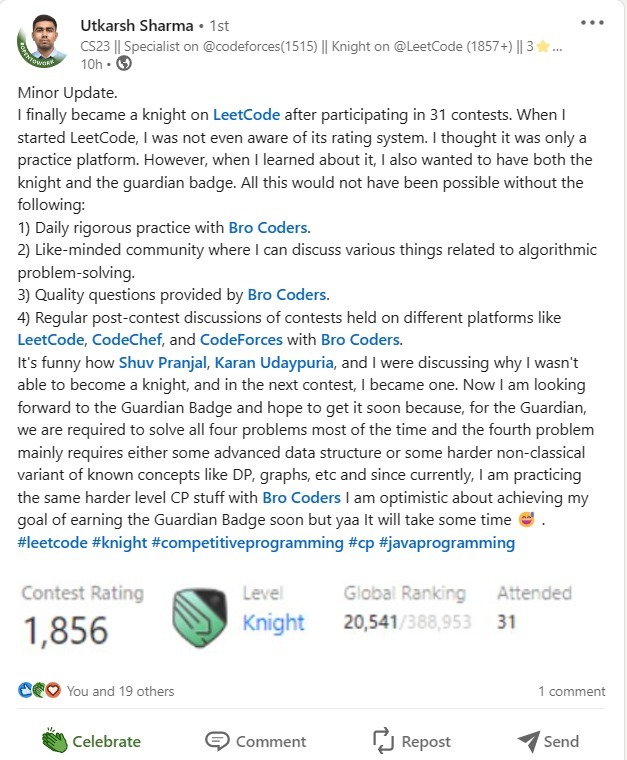 Prachand is the pinnacle of the course, designed for the ambitious and dedicated CP enthusiasts aiming to become true masters of problem-solving. This advanced series delves into complex algorithms, advanced optimization techniques, and cutting-edge problem-solving strategies. By conquering Prachand, you will elevate your problem-solving abilities to an exceptional level, surpassing the skills of the majority of coding enthusiasts. This phase caters to the needs of die-hard CP'ers who aspire to outshine their peers and push the boundaries of their coding prowess.